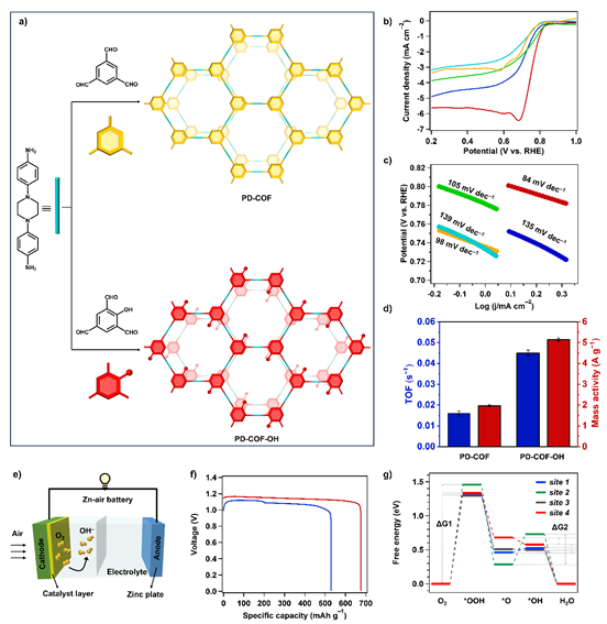 实验表明,具有电子存储特性的催化剂PD-COF-OH在半波电位(E1/2=0.76 V vs. RHE)、转换频率(TOF=0.045 s⁻¹)和电化学活性表面积(Cdl=9.4 mF cm⁻²)等关键指标上均表现优异。理论计算证实,羟基诱导的强极性表面与哌嗪单元的电子存储能力形成协同效应,有效稳定了氧还原反应的关键中间体,显著降低反应能垒。在锌-空气电池测试中,采用PD-COF-OH催化剂的电池展现出111.6 mW cm⁻²的高功率密度和676 mA h g⁻¹的比容量,且具备出色的循环稳定性。
