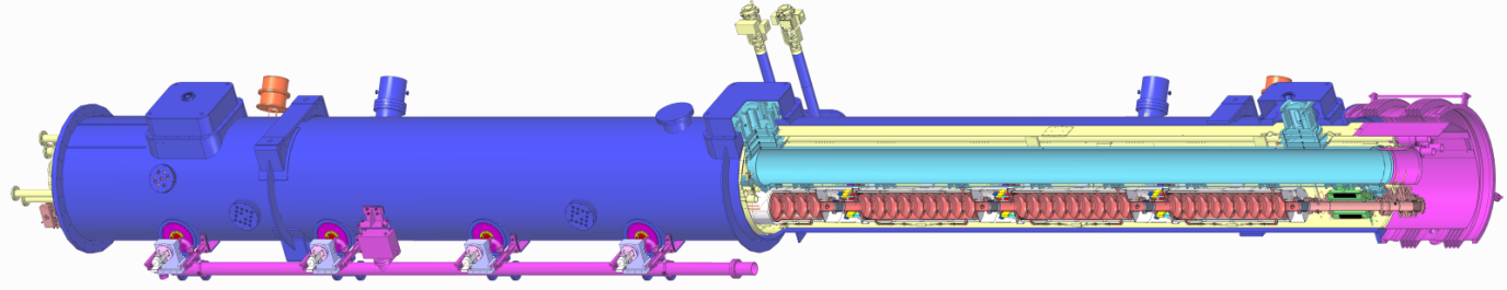 SHINE超导加速器要将电子加速到8.0GeV,共需75套1.3GHz超导加速模组。一套完整的1.3GHz超导加速模组包含了8支9-cell超导高频腔、8套高功率耦合器、8套磁屏蔽、8套调谐器、1台超导磁铁、1只束流位置探头、1台约12米长的低温恒温器,及多种规格的真空元件、低温管线和支撑系统等。这一超导加速模组集超导、高频、真空、超净、低温、机械、磁铁、束测等多项技术于一体,体量大、元件多、结构复杂、技术难度大、研发周期长,是整个SHINE项目最具挑战的大型关键设备之一。
